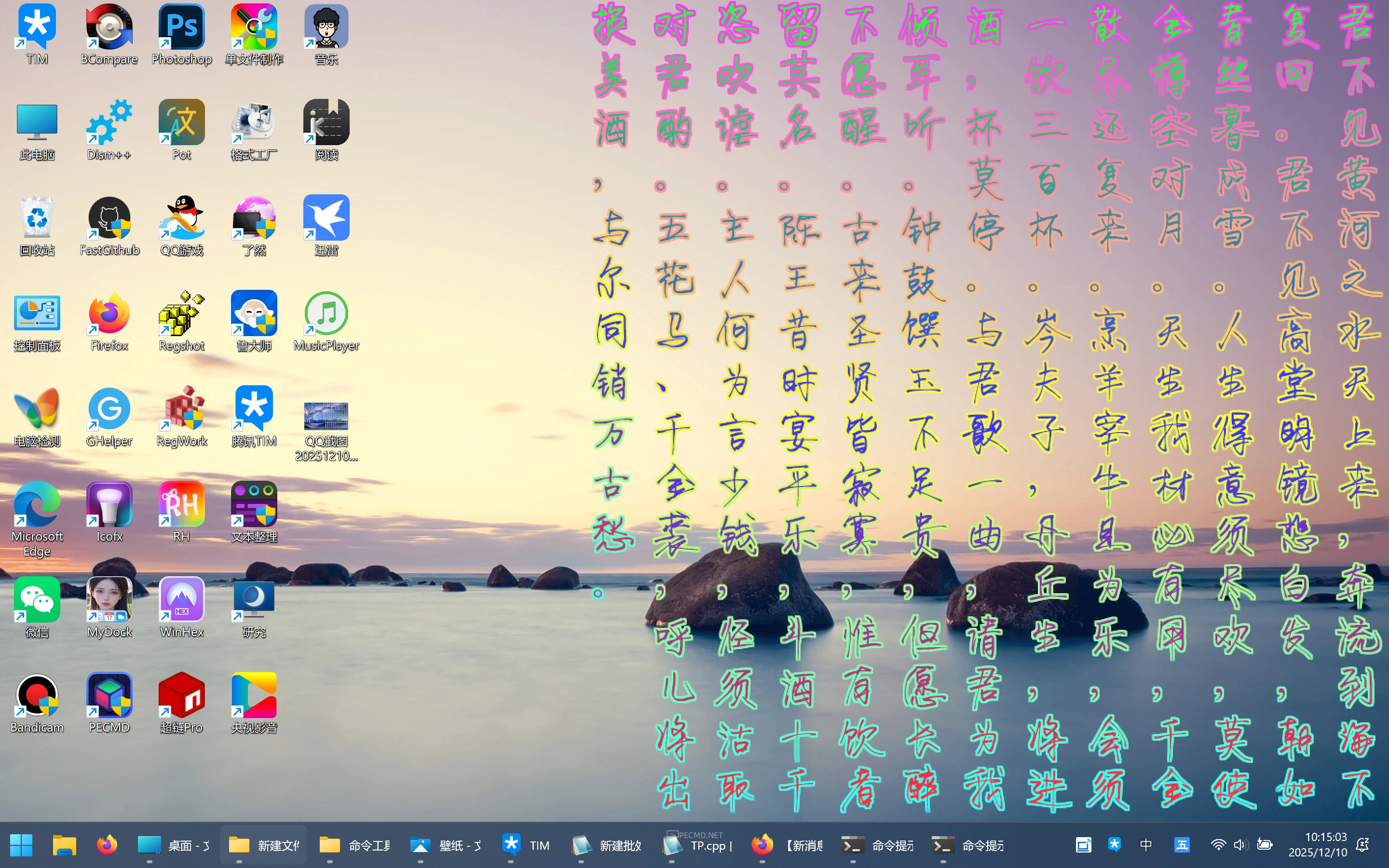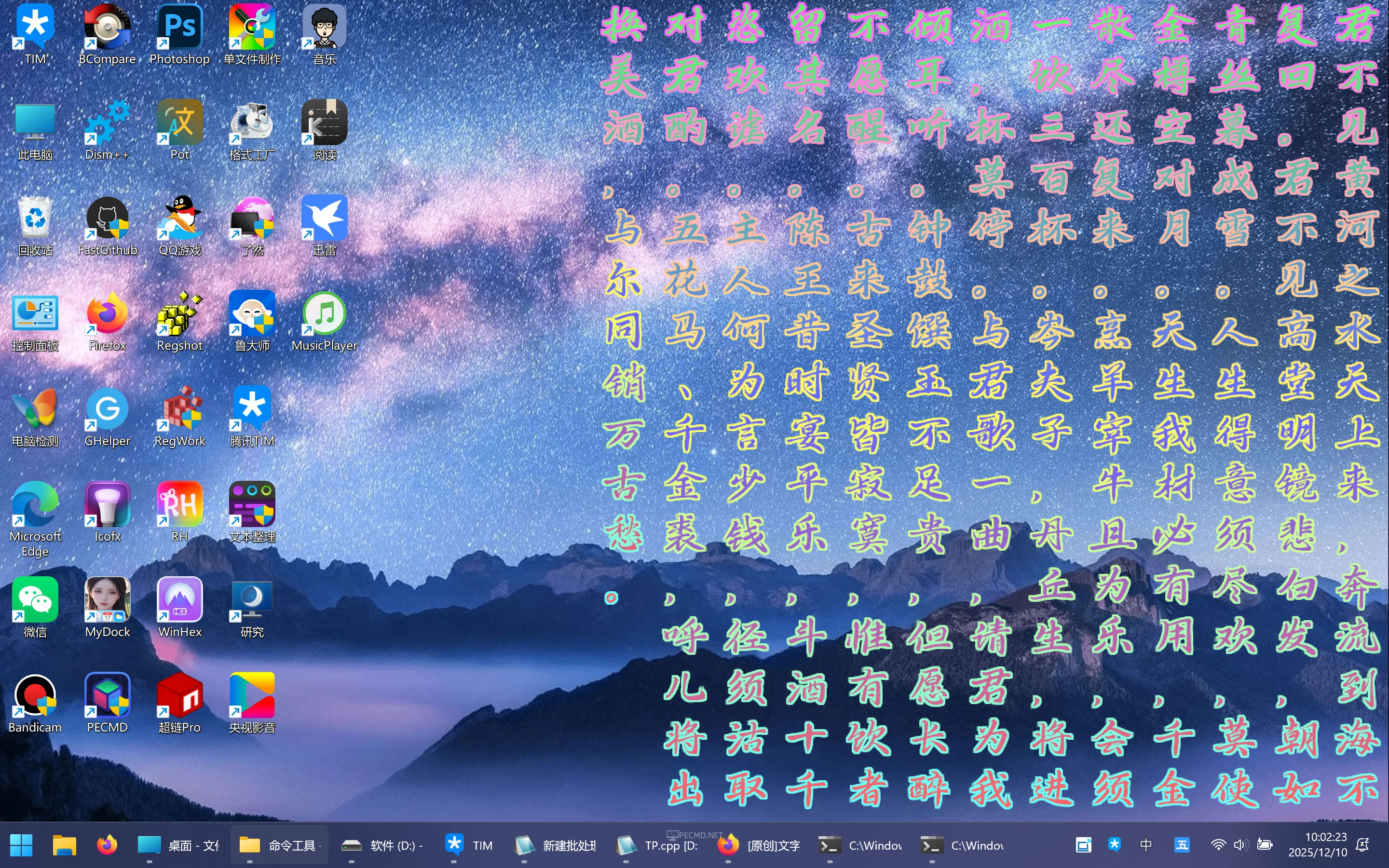 ============================================================================== 文字投屏 --By smss 智能计算渐变、轮廓、时间、换行、字号 更新:https://pecmd.net/thread-1354.htm ============================================================================== 用法: TP.exe [选项] 有空格时用""括起来 /k: <0|1> 0: 终止所有正在运行的其他同名进程,但不会终止自身。 1: 终止找到的第一个其他同名进程,同样不会影响自身。 /e:<0|1|2|3> 排版模式 (默认:0) 0: 横向从左到右 1: 横向从右到左 (每行反转) 2: 纵向从上到下, 列从左到右 3: 纵向从上到下, 列从右到左 (古诗排版) /h:<0|1|2> 横向对齐 (0=左, 1=中, 2=右) (默认:1) /v:<0|1|2> 纵向对齐 (0=顶, 1=中, 2=底) (默认:1) /h: 横向对齐 0左 1中 2右 (默认1) /v: 纵向对齐 0顶 1中 2底 (默认1) /x: 坐标 有则相对于此坐标 /y: 坐标 同上 /f: 字体 (默认微软雅黑) /s: 字号 (默认52) /o: 透明度 范围0-255 (默认255) /i: 斜体 <1|0> 开/关 /u: 下划线 同上 /d: 删除线 同上 /q: 基色 (R G B) 为0时则根据壁纸色调变化 (默认255 0 0) /t: 时间 (ms) 为0时自动计算 (默认0) /m: 文本 (\n换行) 超出屏宽时则滚动播放 /nb 自动换行+微调字号 横向超屏宽/纵向超屏高时生效 当有\n时则 手动换行>自动换行 ============================================================================== 示例: TP /m:朝露昙花, 咫尺天涯 /k:0 /f:楷体 /s:66 /v:0 /i:1 /t:0 /q:"0 255 0" TP /m:"君不见黄河之水天上来,奔流到海不复回。君不见高堂明镜悲白发,朝如青丝暮成雪。人生得意须尽欢,莫使金樽空对月。天生我材必有用,千金散尽还复来。烹羊宰牛且为乐,会须一饮三百杯。岑夫子,丹丘生,将进酒,杯莫停。与君歌一曲,请君为我倾耳听。钟鼓馔玉不足贵,但愿长醉不愿醒。古来圣贤皆寂寞,惟有饮者留其名。陈王昔时宴平乐,斗酒十千恣欢谑。主人何为言少钱,径须沽取对君酌。五花马、千金裘,呼儿将出换美酒,与尔同销万古愁。" /nb /k:0 /e:3 /h:2 /v:0 /f:"荷塘月色手写体" /s:50 /q:"50 255 50" /t:0 完全可以用来显示程序进度 用/k终止 来提示进度 在PE环境时要安装对应字体 没有该字体时会使用找到的第一个字体(有些字体名称中有空格 要用""括起来) ==============================================================================